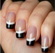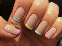 Nessa técnica, as faixas nas pontas das unhas são pintadas de uma cor diferente do branco e, para as mais ousadas, ainda existe a opção de cada unha da mão ter uma faixa de cor diferente. Outra novidade é que a cor principal não precisa, necessariamente, ser em uma tonalidade clara. Muitas optam por um tom nude*.